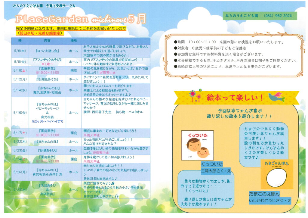 2025年度 5月の予定 2025年4月21日 さわやかな風に、暖かい日差し。 外遊びやお散歩が楽しい季節になりました🍃 5月の日程を掲載します。 今年度も予約制とさせていただいています。 事前に電話にてご予約をよろしくお願いします。 ※PDFはこちら <お知らせ> 電話にて子育て相談も行っています。 子育てや入園、一時保育などに関して疑問や相談があれば連絡お待ちしております。 (月~金)13:00~17:00 ☎(084)962-2024