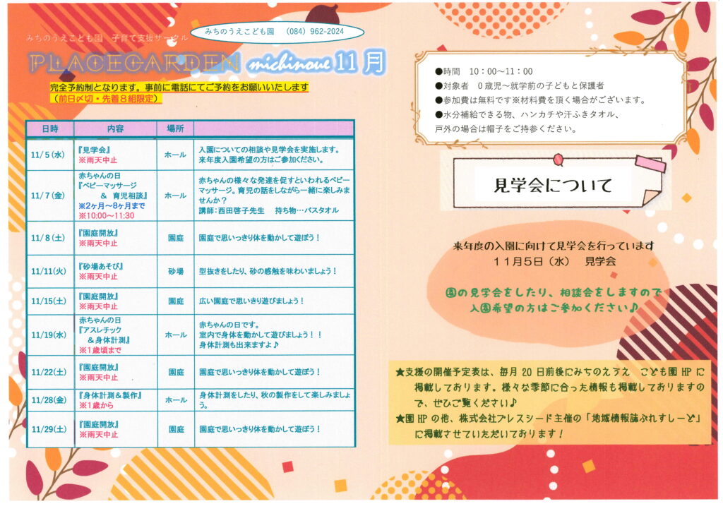11月も来年度の入園に向けての見学会もしますので来年入園を考えられている方はご参加ください。